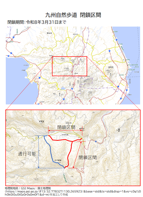 長崎県雲仙市の九千部岳東側の登山道が、間伐作業のため、2026年(令和8年)3月31日まで通行止めとなります。